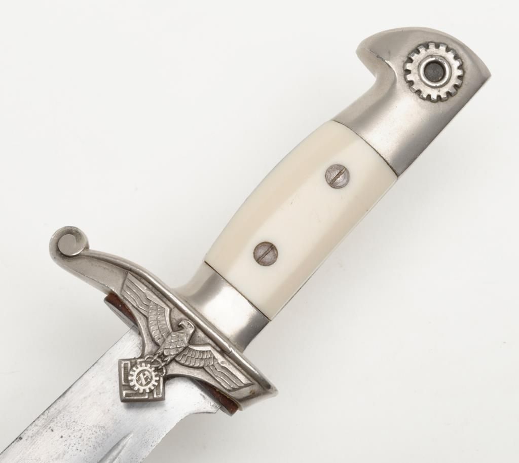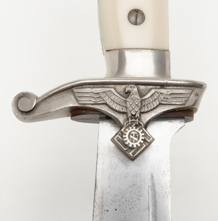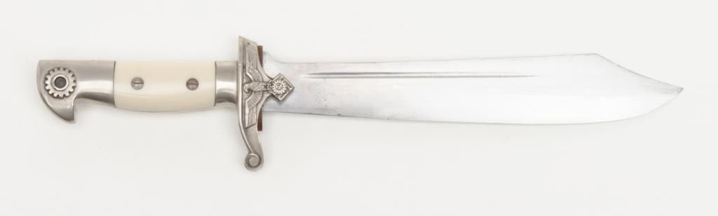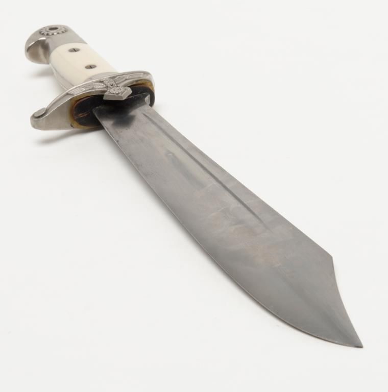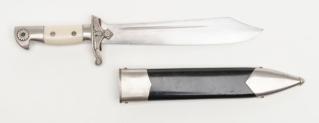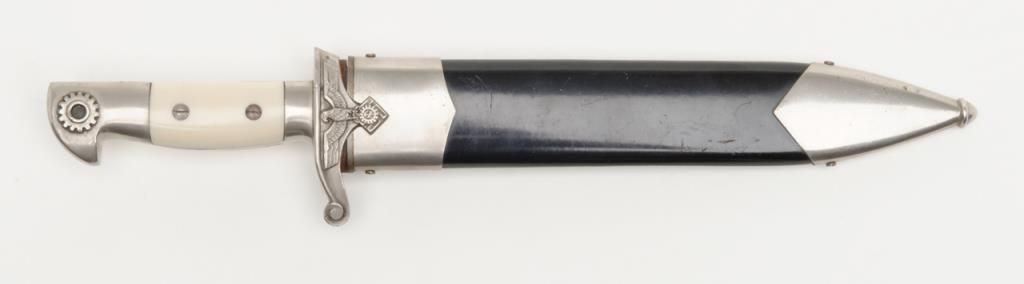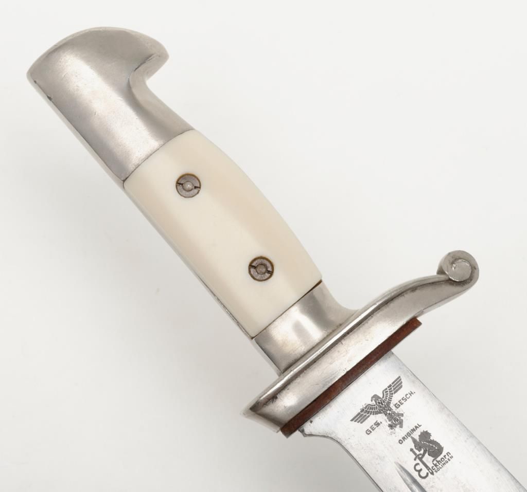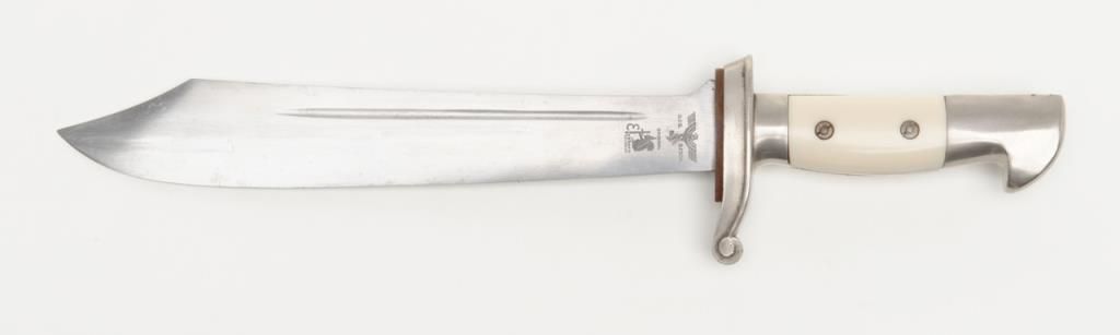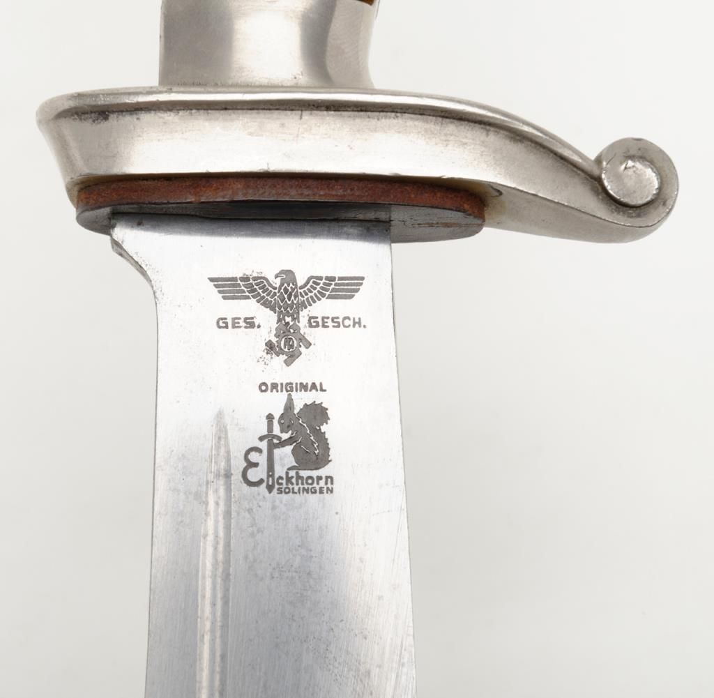 Teno enlisted man’s dagger with “Eickhorn” and “Geo. Gesh” markings on the blade remaining in very good plus to near fine condition. The scabbard shows just some minor crazing and aging. The blade is well marked and near excellent. Est.: $2500-$5000