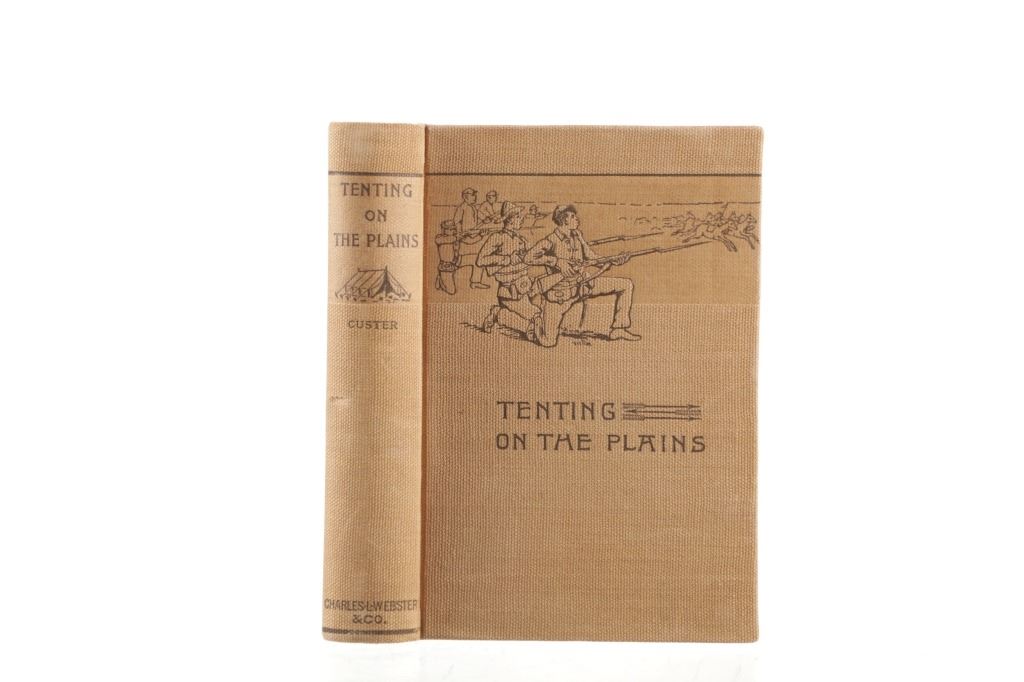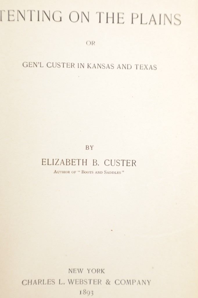 Featured in this lot is this 1893 “Tenting on the Plains” by Elizabeth B. Custer, Charles L. Webster & Company publisher. The book was written by General George Armstrong Custer's wife and provides a descriptive account of General Custer's service in Kansas and Texas with illustrations throughout the book. From the time of her husband’s death at the Battle of the Little Big Horn until her own death fifty-seven years later, at the age of ninety, Mrs. George Armstrong Custer devoted herself to defending or embellishing her husband’s reputation. This account, the second in Elizabeth’s trilogy of her life with the General, focuses on the period immediately following the Civil War, when the Custers were stationed in Louisiana, Texas, and Kansas. She portrays the aftermath of the Civil War in Texas and life in Kansas while her husband took part in General Winfield Hancock’s 1867 expedition against the Indians between the Arkansas and Platte rivers. Throughout, she provides detailed descriptions of an army officer’s home life on the frontier during this major period of Indian unrest. The tan cloth bound stamped illustrated hardcover is in good overall condition, slight scuffing and fading exhibited on covers, spine loose at boards. Intact pages exhibit age tanning and slight foxing, staining on bottom edge. Measures 5"W x 7.25"L x 1.125"D, weight is 1lb, 2oz.