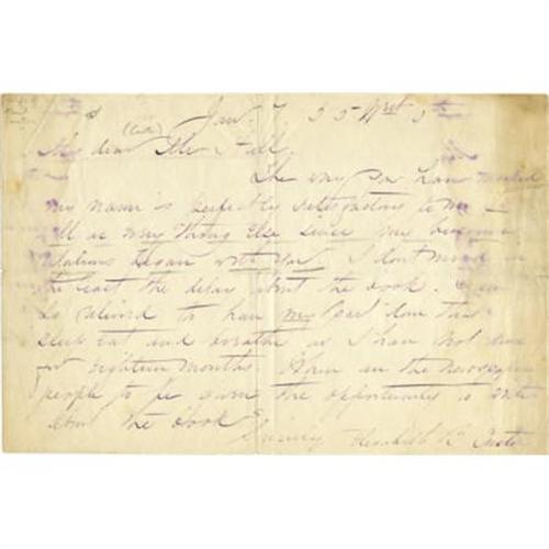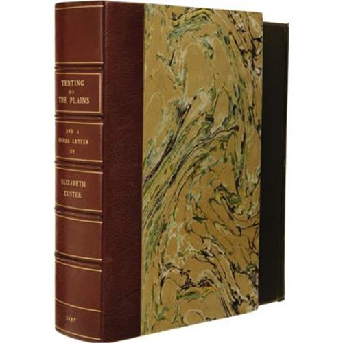 <B>Elizabeth B. Custer: First Edition with a Signed Letter from the Author, of <I>Tenting on the Plains, </B></I></B></I>or General Custer in Kansas and Texas. By Elizabeth B. Custer. (New York: Charles L. Webster & Company, 1887). First edition, and with an autograph letter signed by Elizabeth B. Custer and dated Jan. 7, 55. Octavo (9” x 5.5”). xiii, 702 pages. Illustrated. Publisher's brown cloth decoratively stamped in gilt, blue, red and white, and lettered in gilt and blind. General light wear around the board edges, and at the top and bottom of the spine, hinges starting with previous repair to the front hinge, remnants of labels removed from front and rear endpapers, front free endpaper with repaired tear, perhaps an ex-library copy with the only markings being a string of ink numbers at the bottom of the dedication page. Altogether a very clean, handsome copy in very good condition. Elizabeth Custer's letter is on watermarked laid note paper measuring 8.5” x 5.5”, with three folds and slight splitting at the center corner of the folds. There is a dampstain to the outer margins of the page, affecting about 16 words and the end of her signature. The letter is in eleven lines, and begins: “My Dear Mr. Hall, The way you have mentioned by name is perfectly satisfactory to me…” The book and letter are housed together in a quarter morocco over marbled paper slipcase with a book-back spine in six compartments with five raised bands and gilt lettering and rules.<BR><BR><b>Shipping:</b> Books & Catalogs (<a target="_blank" href="http://www.heritageauctions.com/common/shipping.php">view shipping information</a>)