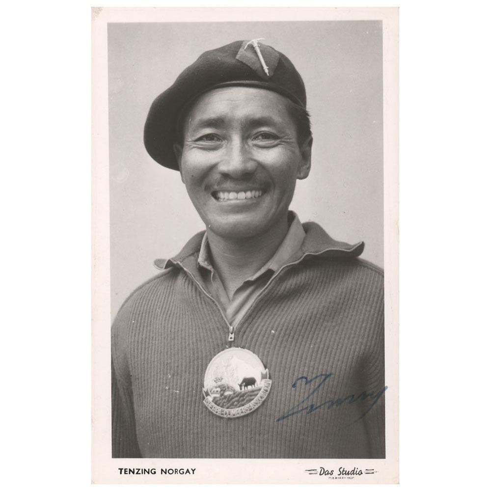 Glossy 3.5 x 5.5 postcard photo of Tenzing Norgay smiling with a Sherpa Climbers Association patch on his chest, signed in black ink. In fine condition, with a small crease on the bridge of his nose.