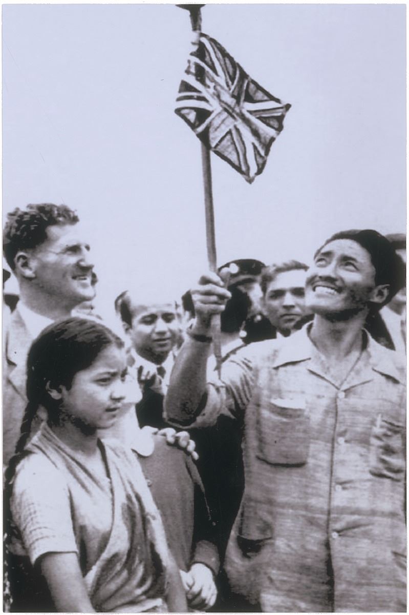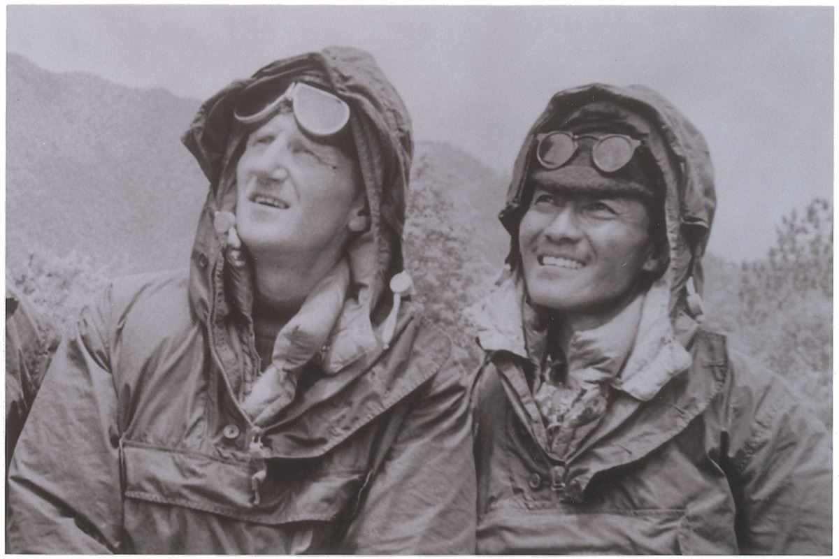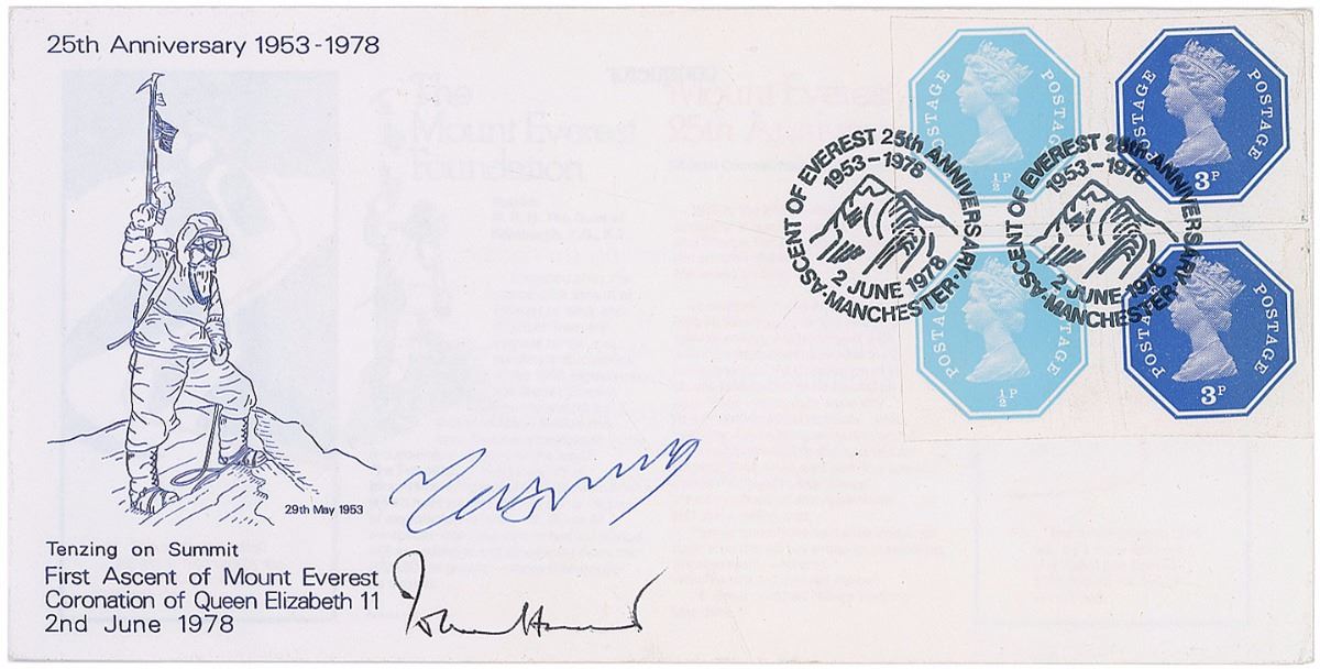 British commemorative cover with a cachet honoring the twenty-fifth anniversary of man’s first ascent of Mount Everest, 8.75 x 4.25, signed in blue ballpoint by Tenzing Norgay and black ballpoint by John Hunt. In fine condition. Accompanied by two small modern glossy photos. Hunt led the 1953 British Mt. Everest expedition, during which Norgay and Edmund Hillary became the first men to reach the summit.