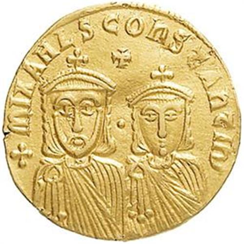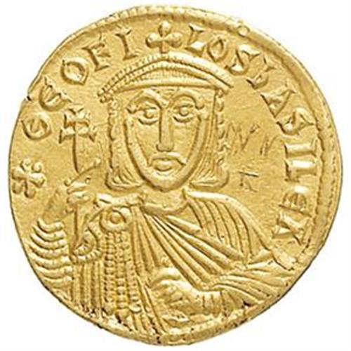Monete Bizantine. Teofilo (829-842). Solido, Constantinople. D/ Busto frontale di Teofilo, con corona e clamide, che tiene croce patriarcale e akakia. R/ I busti frontali di Michele II e Constantine, con corona e clamide. Tra le loro teste, una croce. D.O. 3. gr. 4.39 R. AU. Interessanti lettere graffite nel campo del D/, quasi impercettibili, altrimenti qSPL.