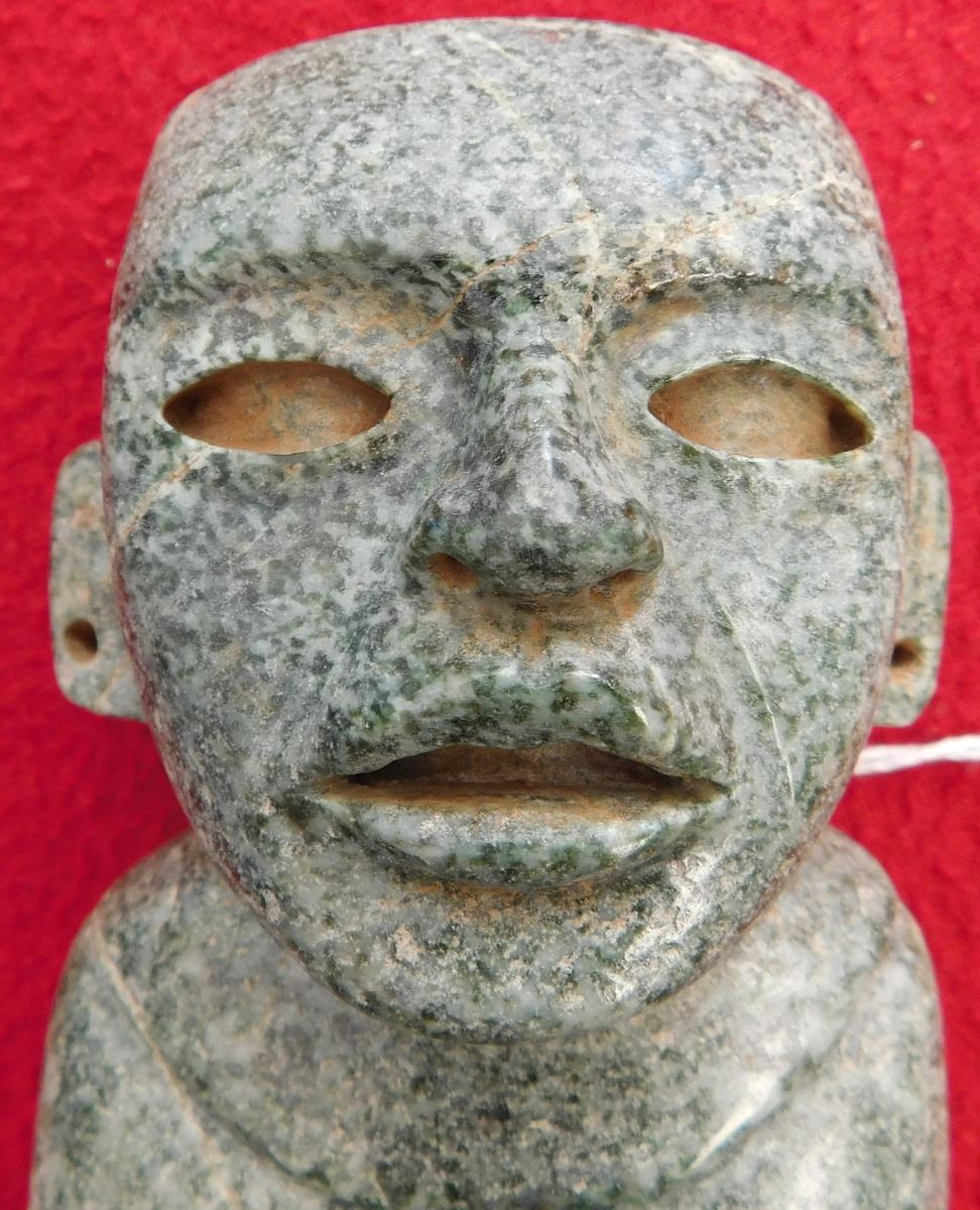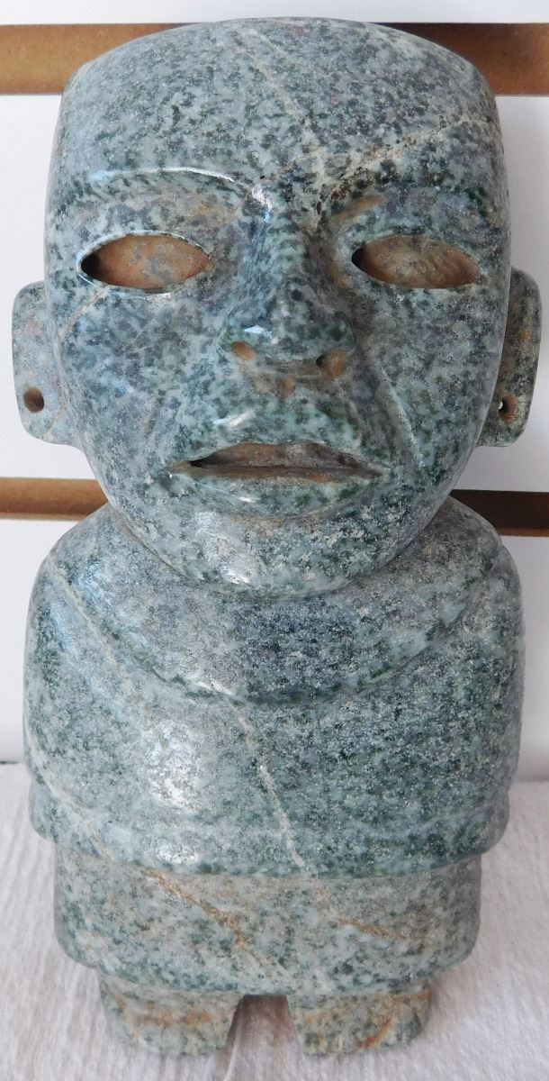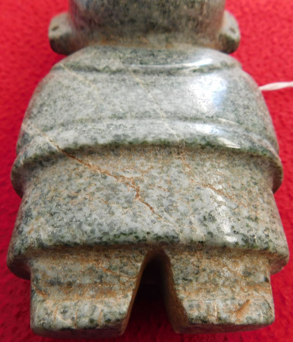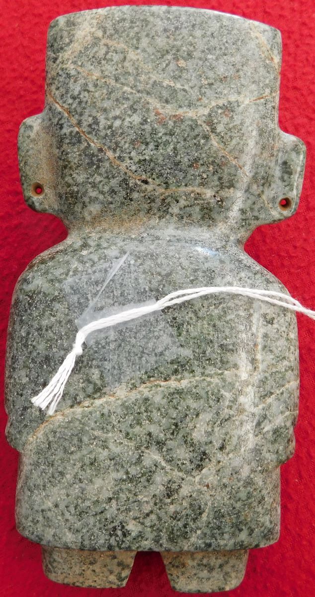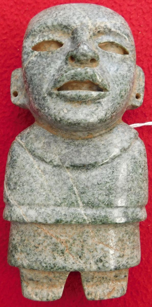 Teotihuacan Jadeite Figure, circa 1600 years old. Made of jadeite, this pre-columbian figure is 6" x 3.25" x 2.25". Teo, Mexico City, Mexico. From an old, 1960s California collection. Condition: Has been overcleaned to reveal ancient polish, natural patina can be seen in crevices of carved figure, see images. Shipping: $25.50 w/insurance and signature.