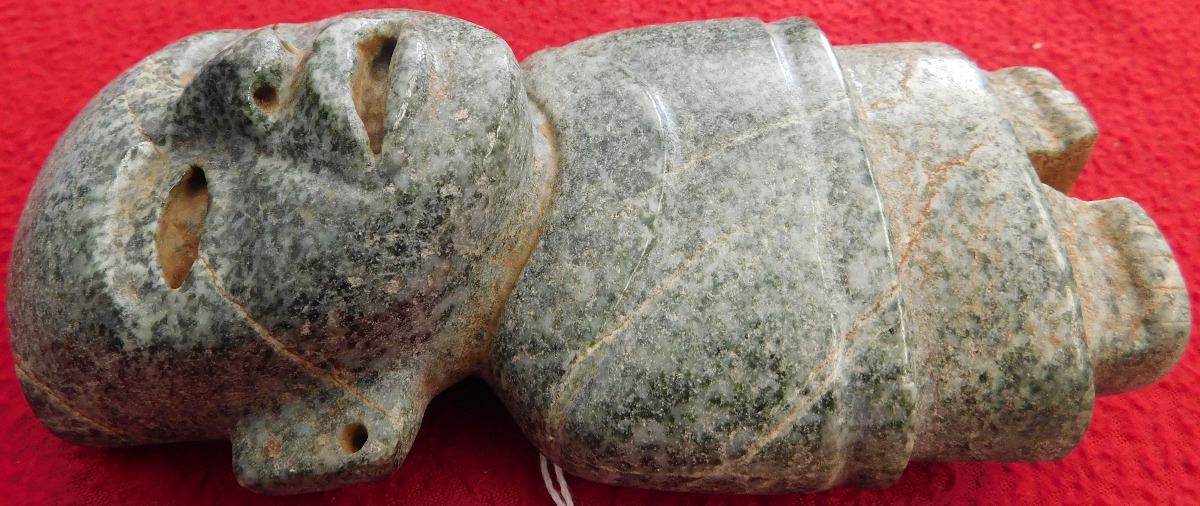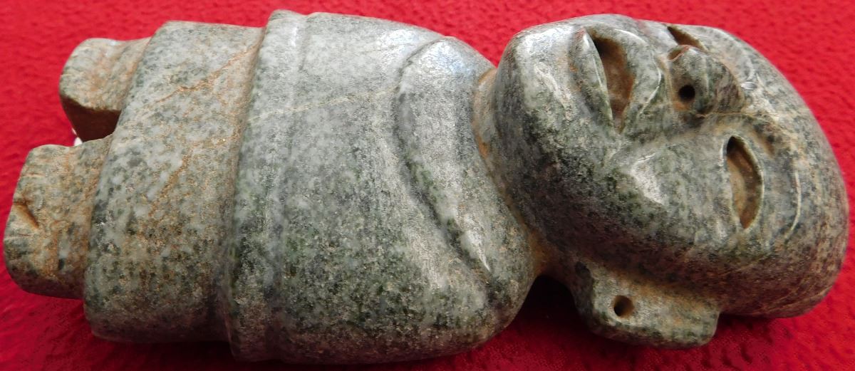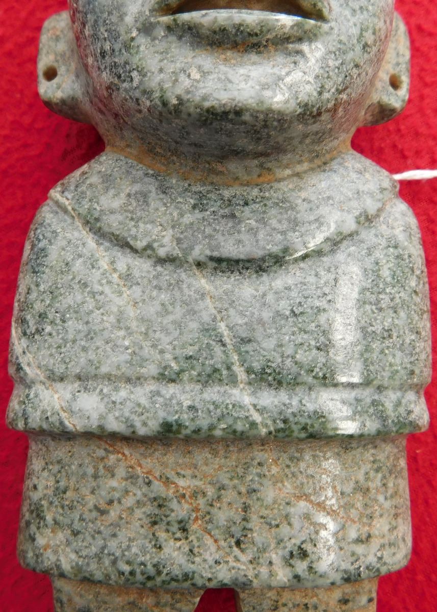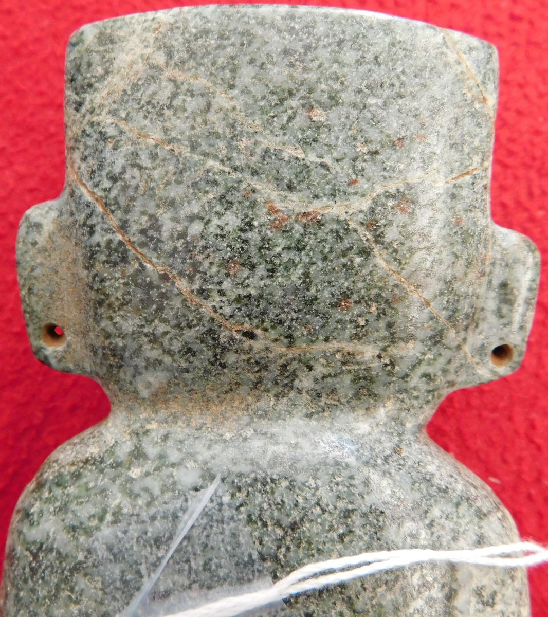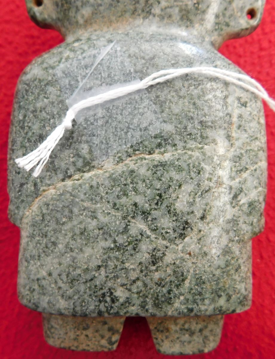 Teotihuacan Jadeite Figure, circa 1600 years old. Made of jadeite, this pre-columbian figure is 6" x 3.25" x 2.25". Teo, Mexico City, Mexico. From an old, 1960s California collection. Condition: Has been overcleaned to reveal ancient polish, natural patina can be seen in crevices of carved figure, see images. Shipping: $25.50 w/insurance and signature.