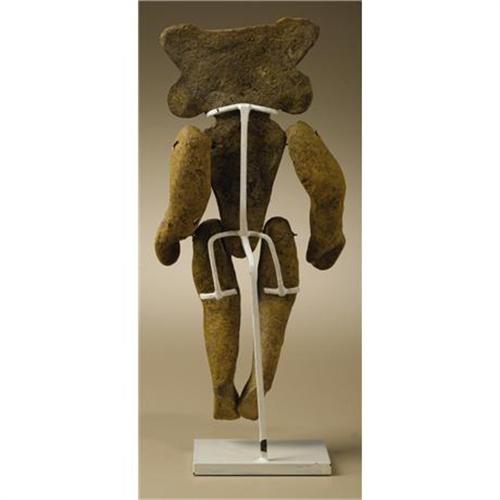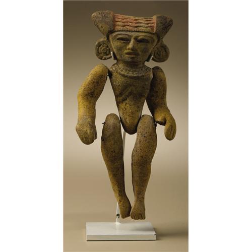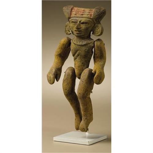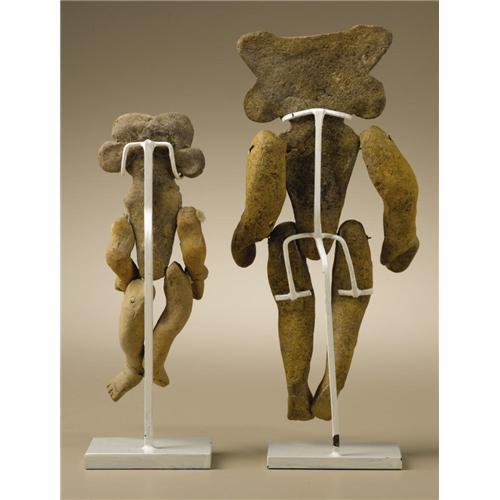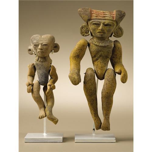 <B>Two Articulated Figures (A,B)</B></I><BR>Teotihuacan<BR>A.D. 300 - 600<BR>Ceramic (A,B), traces of original paint (B)<BR>(A) Height 4 5/8 in.<BR>(B) Height 6 1/2 in.<BR><BR>Both articulated figures are comprised of five parts, which were intended to be joined by tying: a head and torso unit and separate arms and legs. The smaller figure has a cleft head, ear spools and a necklace, with bracelets on both arms. The larger figure has a three-part headdress, more elaborate ear spools with four-petaled flower centers, and a necklace. The torso of the larger figure is developed anatomically to indicate the rib cage. All components of both figures are in good condition, with the larger having residues of red and yellow paint, a small chip at the proper left shoulder, and a missing proper left thumb. Mist spraying of both figures resulted in uniform drying speed of all parts, suggesting that in both cases the parts belong together.<BR>An articulated figure of which the head-torso unit appears to be from the same mold as the larger figure here is illustrated in Kathleen Berrin and Esther Pasztory, eds. <I>Teotihuacan Art from the City of the Gods.</B></I> London: Thames and Hudson, 1993, p.234, no.104, right figure.<BR><BR>Provenance<BR>Skinner, Boston: sale 2209, 20 September 2003: lot 23 (ill. p.12)<BR><BR>