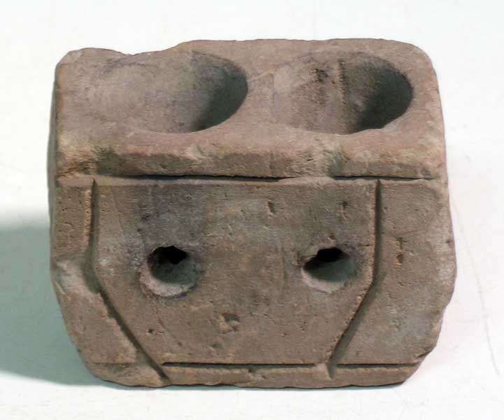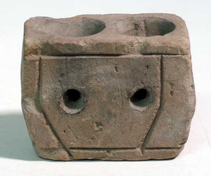 An excellent Teotihuacan candelero from Mexico, c. AD 400 - 650, a fine Xolalpan type double-chambered incense burner decorated with a burnished rim and linear designs. W: 3 in. Intact, with good mineral deposits and find site information inscribed on the bottom. Ex Magor collection. Cf. Berrin, Teotihuacan page 239 for similar from the Smithsonian.