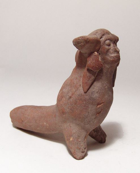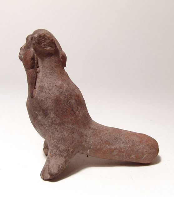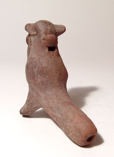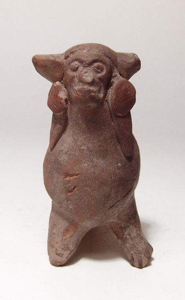 A nice Teotihuacan standing whistle figure, Mexico, c. AD 400 - 650, wearing elaborate headdress with remnants of red cinnabar. H: 3 1/2 in; L: 4 in. Intact, light deposits. Ex Dr. John Hilsabeck estate, Orange County.