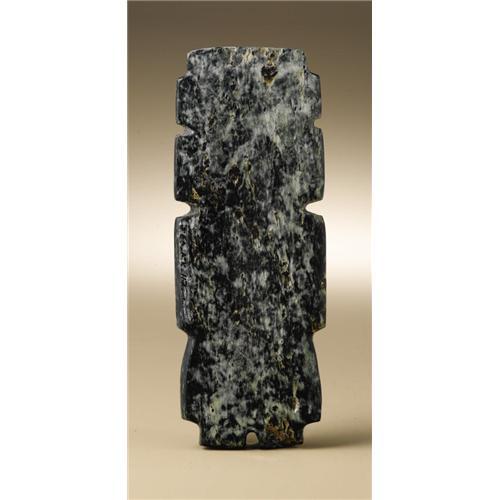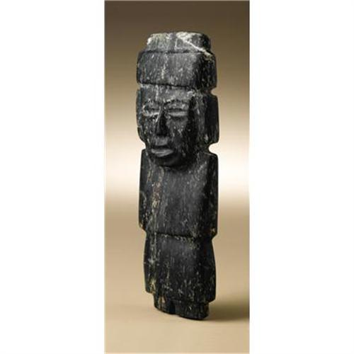 <B>Standing Dignitary</B></I><BR>Teotihuacan<BR>A.D. 300 - 600<BR>Green stone<BR>Height 5 3/8 in. Width 2 in.<BR><BR>A rather simplified representation of a fully clothed standing figure with plain, banded headdress, this image in dark green stone is relatively thin and flat. As represented, both upper and lower garments suggest female clothing, and their effect does relate to published representations considered to be female figures (Kathleen Berrin and Esther Pasztory, eds. <I>Teotihuacan Art from the City of the Gods.</B></I> London: Thames and Hudson, 1993, p.179, no.16). The condition is good, with small chips at top and some material missing at the rear of the proper right foot. "Teo. KK-H7" appears on the back of the figure.<BR><BR>Provenance<BR>David Walley, Pontotoc, Mississippi<BR><BR>