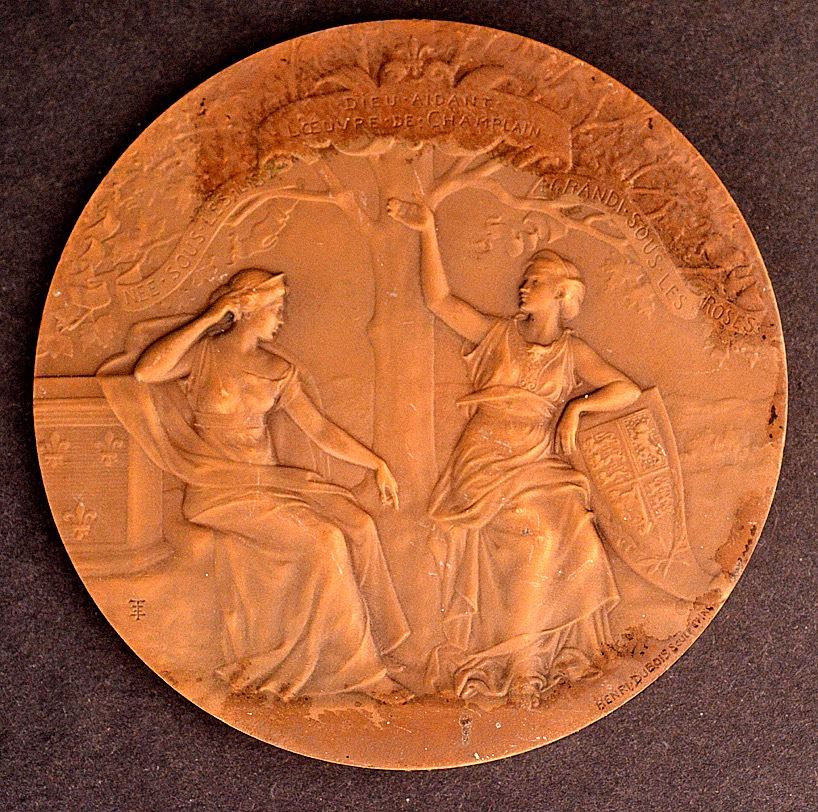 Obverse: Champlain holding a sword aloft stepping ashore from a sailing vessel, crowned monograms of Henri IV and Edward VII either side. IIIe . CENTENAIRE . DE . LA . FONDATION . DE . QUEBEC. On a plaque below: STADACONE Reverse: Two female allegorical figures, one with a pedestal bearing French lilies, the other resting on the British shield, seated beneath a tree with riband inscribed NEE SOUS LES LIS/DIEU AIDANT./L'OEUVRE.DE CHAMPLAIN/A.GRANDI.SOUS.LES.ROSES ; Ae, 77mm, marked Bronze on edge, VF, but stained on reverse.