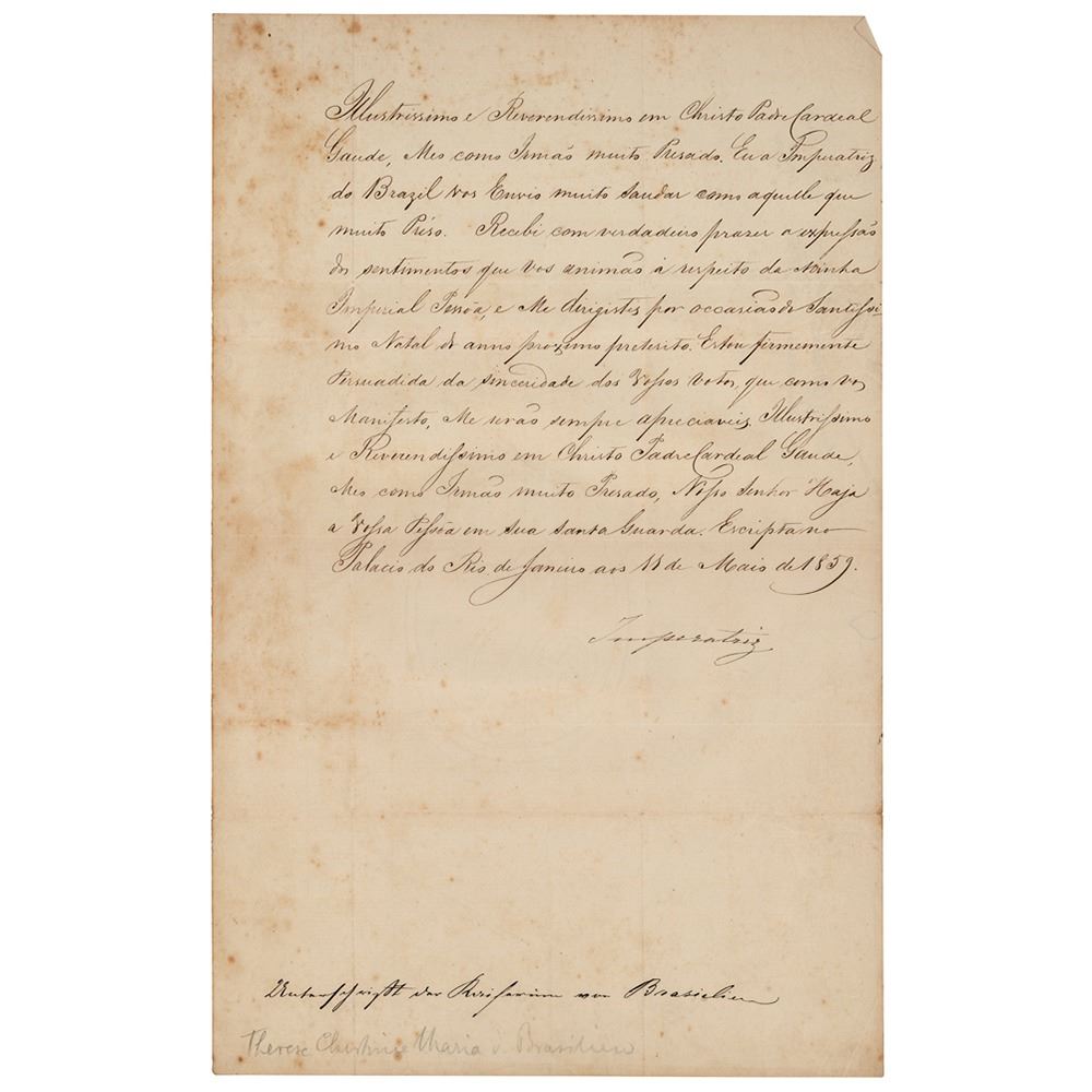Empress consort of Emperor Dom Pedro II of Brazil, nicknamed 'The Mother of the Brazilians' (1822–1889). Manuscript DS in Portuguese, signed “Imperatriz,†one page, 8 x 13, May 11, 1859. Untranslated official document signed by Teresa Cristina as empress consort of Brazil. In very good to fine condition, with intersecting folds and scattered foxing.