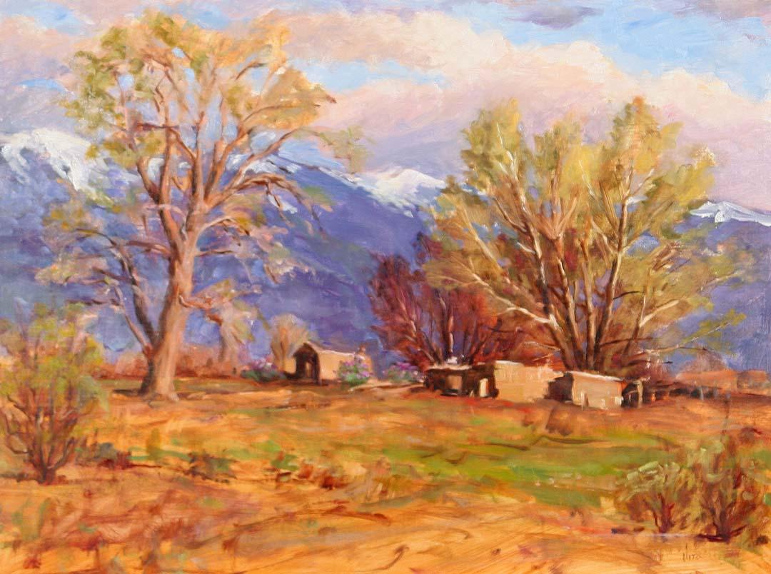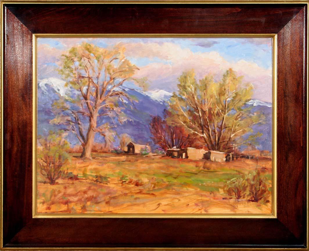 Teresa Vito (20th Century). Evening Descending Upon Adobe In Spring. 18" x 24" oil on board. Signed lower right & verso. (est $1,500-2,500). For condition reports please visit: www.auctioninsantafe.com/cr2011.pdf