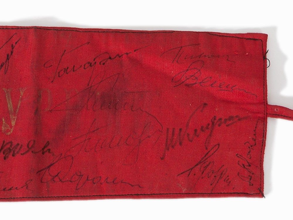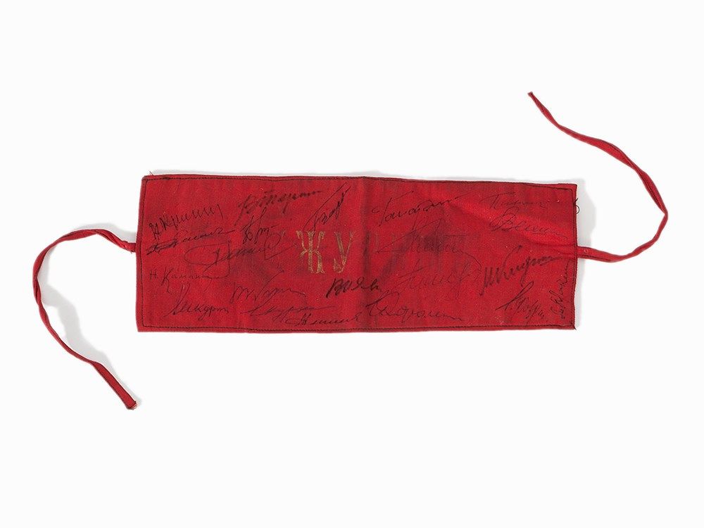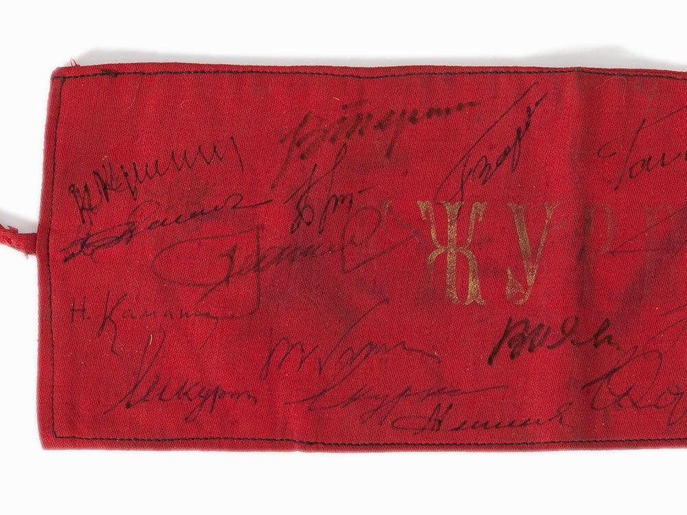 This red armband is a very significant object which witnessed the historical event when the first woman flew into space with the Vostok 6. The most important participants signed this armband to commemorate their attendance at this historical event. The armbands of this type were worn only by authorized persons before the start of the Vostok 6 at the launch pad. Vostok 6 was the space flight of the first woman in space, Valentina Tereshkova (b. 1937). The spacecraft was launched on 16.06.1963 from the Baikonur Cosmodrome and Tereshkova landed safely back on earth in a capsule on 19.06.1963 after she has orbited the earth 49 times. The red armband shows the signatures by the academics Korolev, Keldish, Mitin, Pelushka and Kosmzok, as well as by the members of the Federal Commission Kerimov and Kam… and the commander of the spacecraft Vostok 6 Tereshkova and the cosmonauts Gagarin, Titov, Popovich, Leonov, Gorbadga and others.