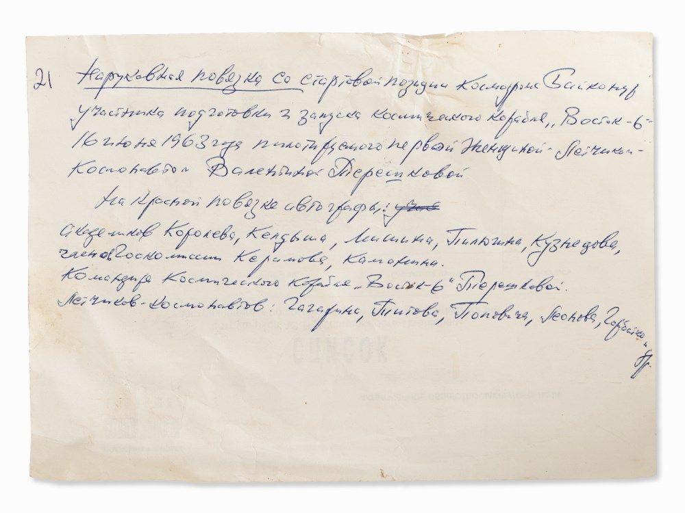 Signed by Tereshkova, Gagarin, Leonov, Korolev, Popovich, Titov et al.