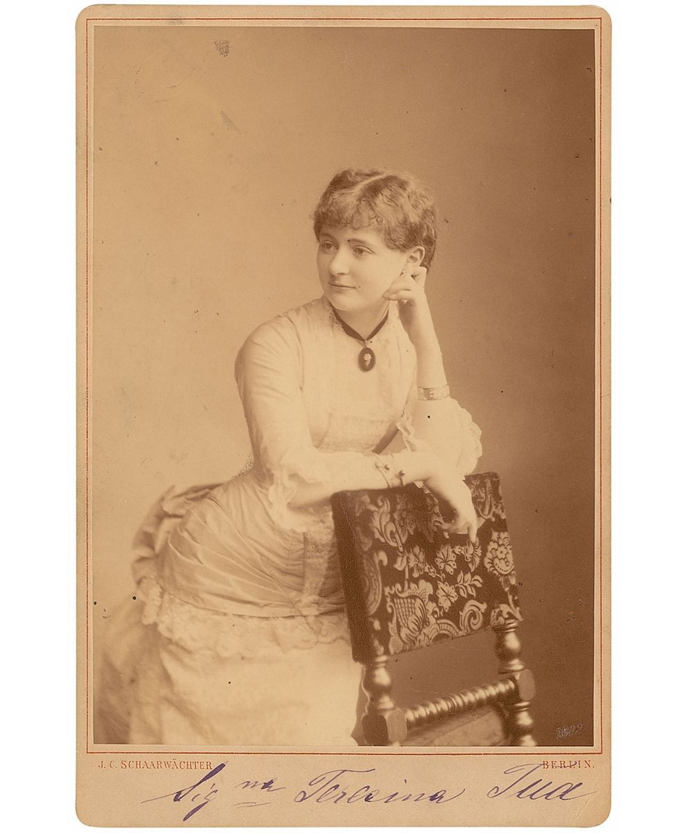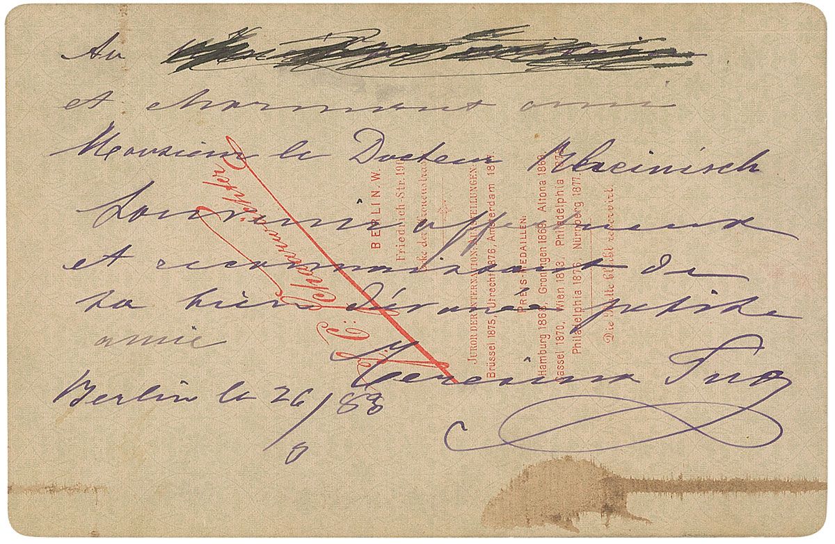 Italian violinist (c. 1866–1956) of ephemeral fame, known as the ‘violin fairy.’ Original 4.25 x 6.5 cabinet photo by Schaarwachter of Berlin, signed and inscribed with a lengthy French sentiment on the reverse in purple ink, and dated 1888. Front lower border bears an ink collector’s notation. Scattered surface marks to the image, a small area of staining to the reverse, and ink marks crossing out a first attempt at the inscription, otherwise fine condition.