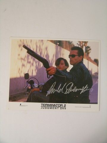 From the grand mega-budgeted "Terminator 2: Judgment Day" this is an oversized original studio lobby card showing Arnold and Edward Furlong (playing the young John Connor), riding down the Los Angeles River on motorcycle. This dramatic collectable is personally signed by Arnold Schwarzenegger himself! (14"x11").