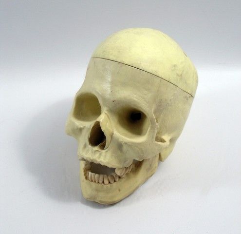 Terminator 2 Human Skull Prop - James Cameron's budget went from a few million to over One Hundred Million in is sequel "Terminator 2: Judgment Day". And it showed! It was a good gamble since the box office was almost eight times the budget! This is a plastic human skull used as a background set-decoration prop in the bleak battlefield sequences. (Approx. 8" x 6 1/2").