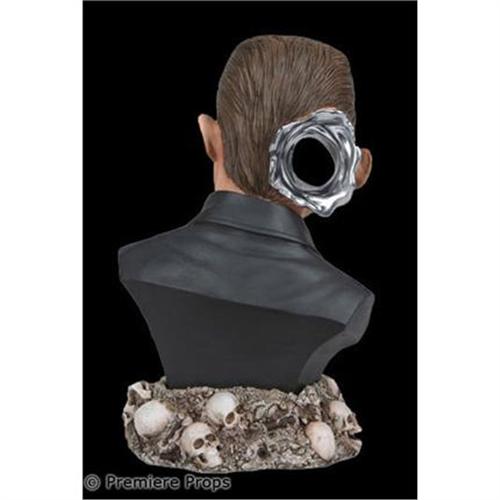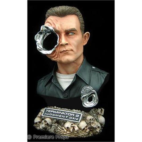 "Terminator 2: Judgement Day" - To celebrate the 15th Anniversary of this modern classic film, this is the T-1000 Legendary Scale Bust. Robert Patrick's likeness has been expertly reproduced in approximately 1:2 scale by accomplished sculptor Jeff Yagher. Captured in his temporarily damaged state with a gaping hole directly through his head, the T-1000 is cast in solid, high-quality polystone, and mounted on a detailed skull base. (approx. 11" x 14" x 8" in box).