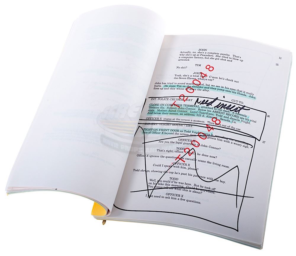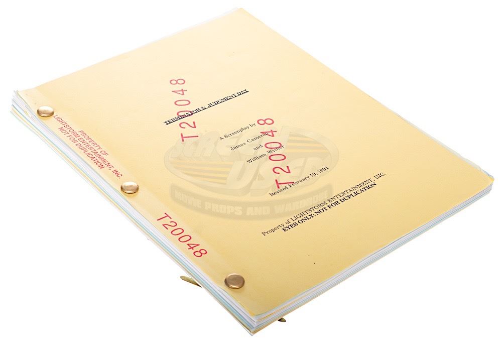 (Carolco Pictures, 1991) This original production script was issued to a member of the film's crew during the production. The script is very unique, as it contains highlighted sections, sections crossed out and a few handwritten notes made during production of the film. Each page features the hand stamp "T20048" that was unique to a crew member. This stamp was done by the studio to keep track of who the scripts were issued to in case copies ever showed up outside of the production team. The pages have minor wear consistent with use, but remain in good condition. A very rare production artifact.