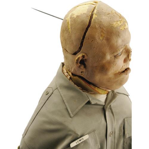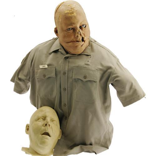 <B>"Terminator 2: Judgment Day" Stunt Prop.</B></I> This prop head and torso are part of device used in the 1991 sequel for a scene in which the villainous T-1000 assumes the form of a hapless security guard and then promptly does him with a spike through the head. Twin actors Don and Dan Stanton were used for portions of the scene, one of several filmed with the use of identical twins (in fact, Linda Hamilton's twin sister Leslie was used as a double in scenes involving two Sarah Connors). A very gruesome, one-of-a-kind prop, in Very Fine condition with a little wear from rigorous use.