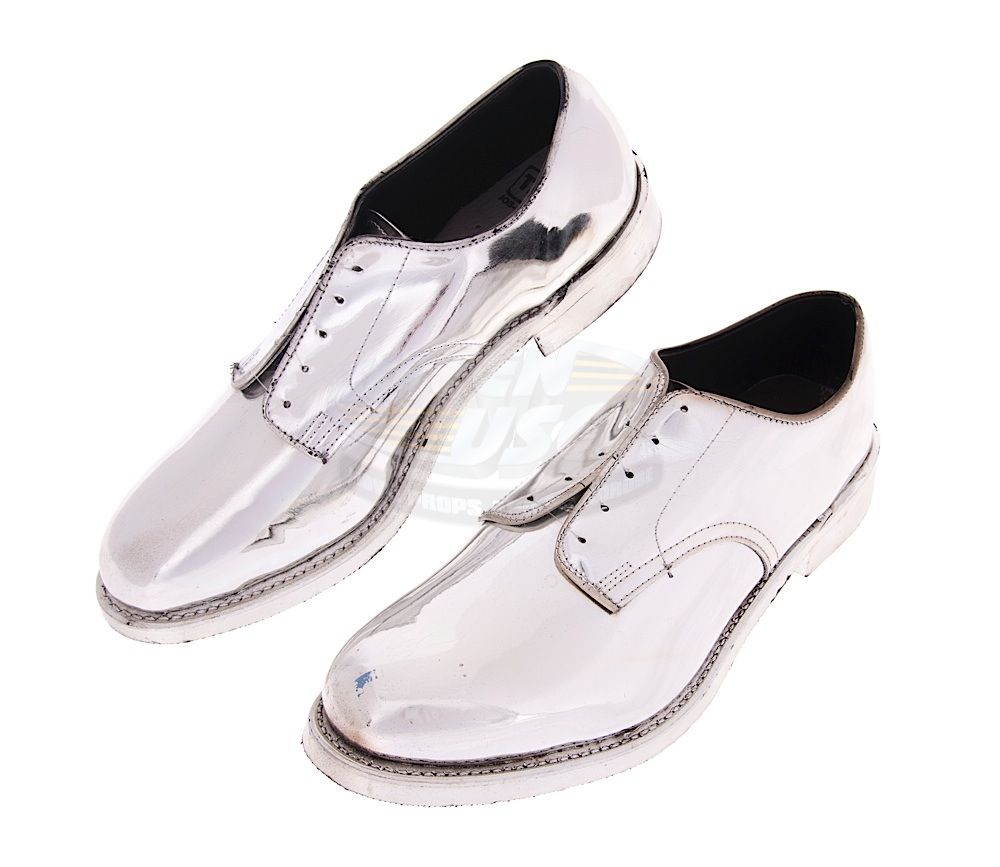 (Carolco Pictures, 1991) These pair of police shoes were acquired by the production and customized with a chrome finish for use by Robert Patrick as the "T-1000". This special pair of shoes were used for effects shots of the T-1000 transformation scenes. The shoes have minor wear from use, but remain in very good condition.