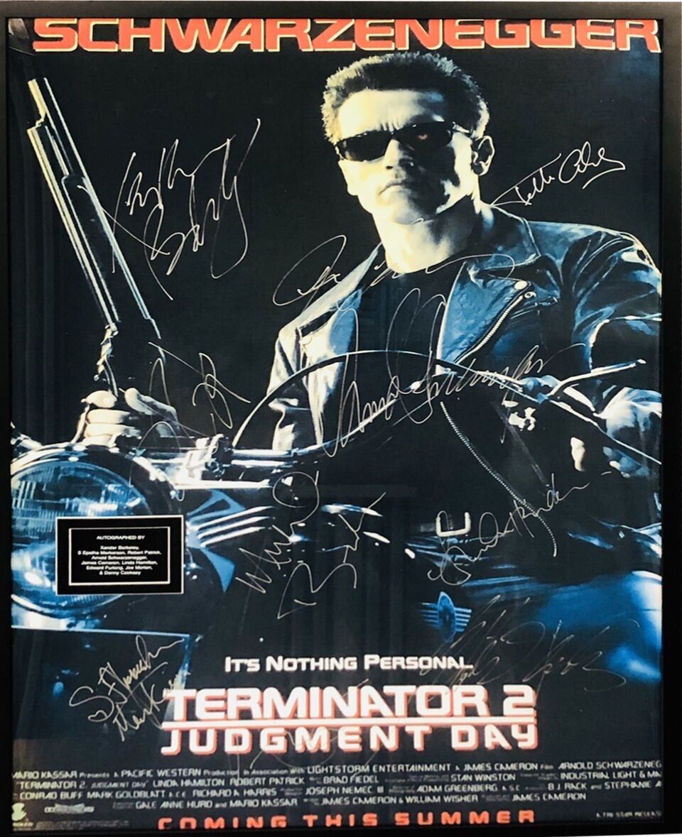 "Terminator 2: Judgement Day" framed autographed movie poster. In this sequel set eleven years after "The Terminator," young John Connor (Edward Furlong), the key to civilization's victory over a future robot uprising, is the target of the shape-shifting T-1000 (Robert Patrick), a Terminator sent from the future to kill him. Another Terminator, the revamped T-800 (Arnold Schwarzenegger), has been sent back to protect the boy. As John and his mother (Linda Hamilton) go on the run with the T-800, the boy forms an unexpected bond with the robot. This poster is autographed by Arnold Schwarzenegger, Danny Cooksey, Linda Hamilton, Edward Furlong, Robert Patriek, Joe Morton, S. Epatha Merkerson, Xander Berkeley, director James Cameron. .This item comes with a Certificate of Authenticity from a third party authenticator. This Certification of Authenticity does not imply that the item will be certified by any other rival authentication companies. The accompanied certification is the only certification the auction company can confirm. These items are being sold as collectable pieces and there is no guarantee that this item can be resold on any online marketplace. Each of these companies has their own policies and politics.