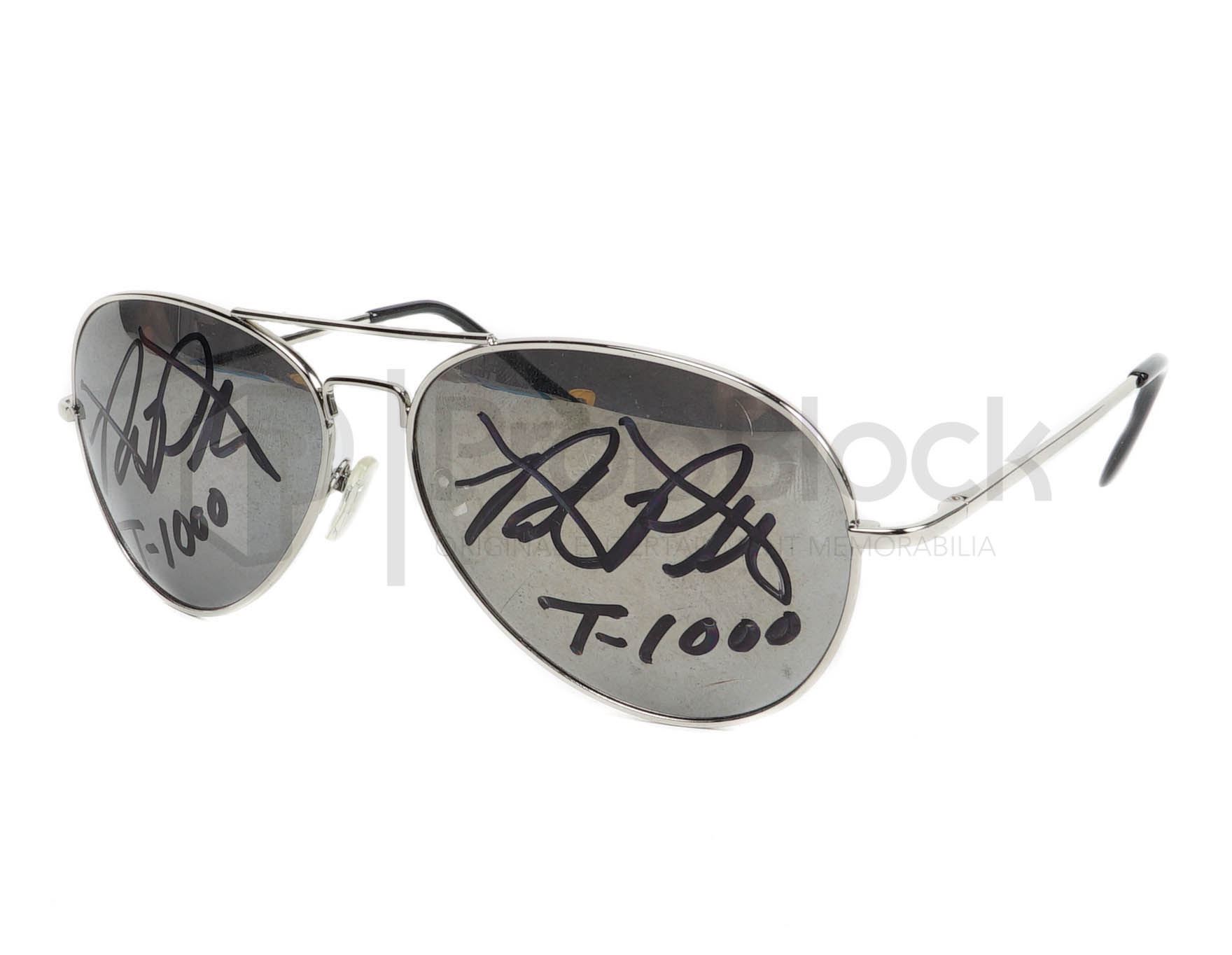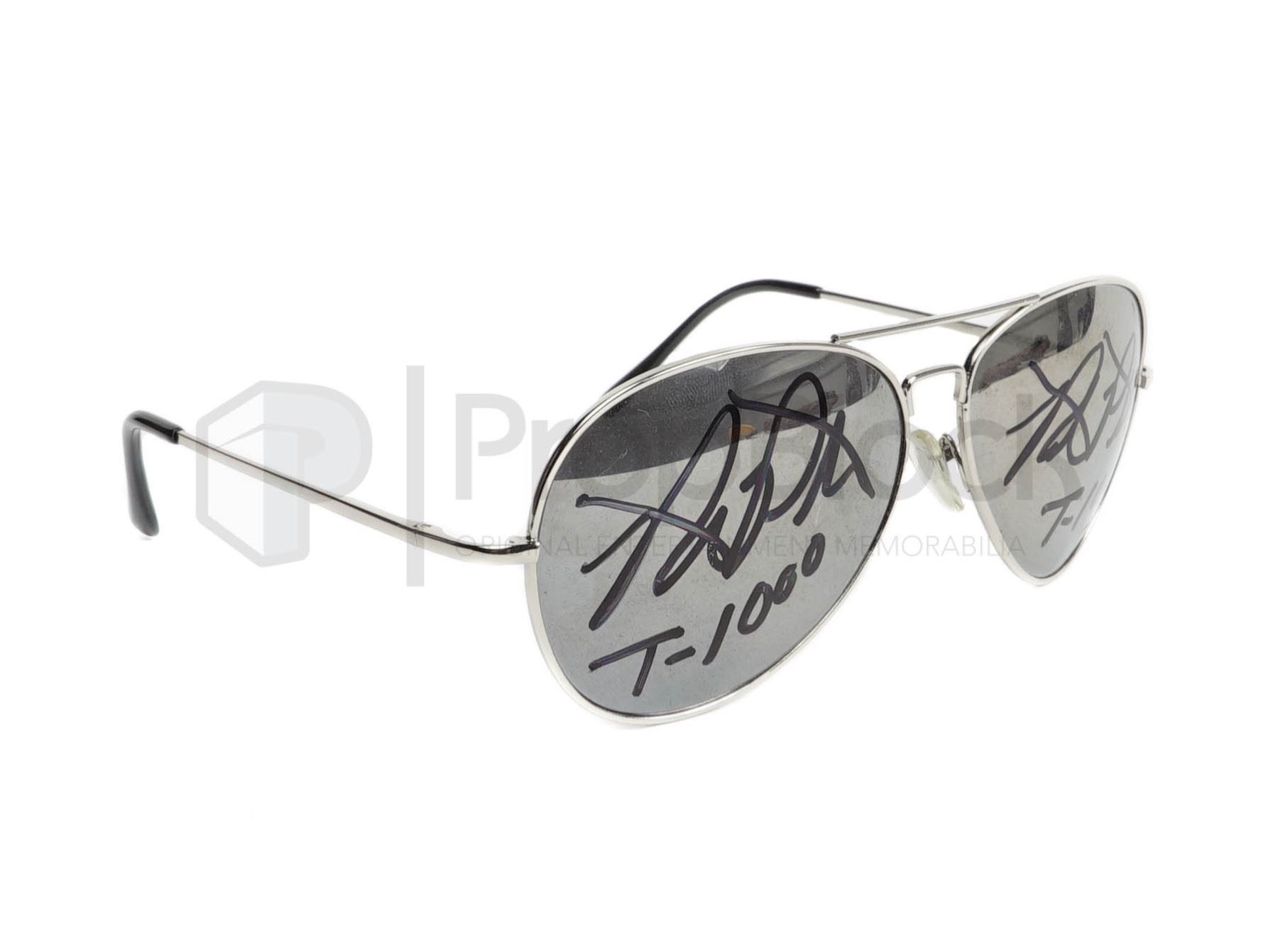 Pair of glasses worn by the character of T-1000, actor Robert Patrick in the 1991 action science fiction film Terminator 2: Judgement Day. These aviator style glasses can be seen throughout the film as part of the villains main attire. These glasses features a silver metal frame with black ear tip and polarized metallic lenses. Each lens has been and signed by the actor Robert Patrick. Although signed, the signatures could be removed if you wish to display these as just a prop. These glasses remain in excellent, production used condition.