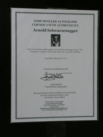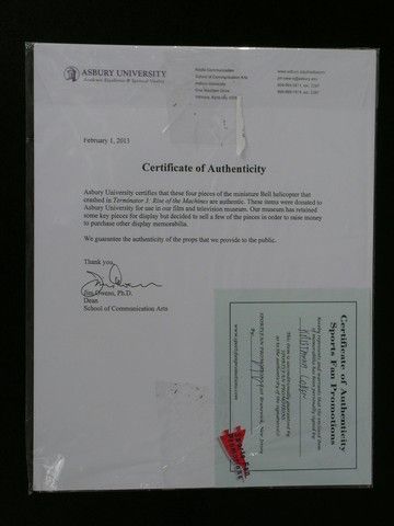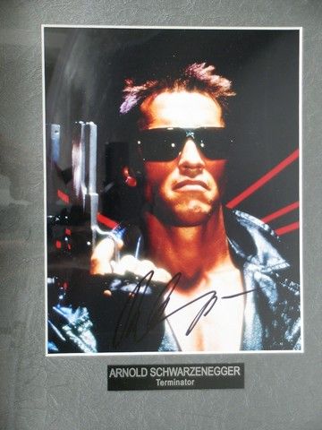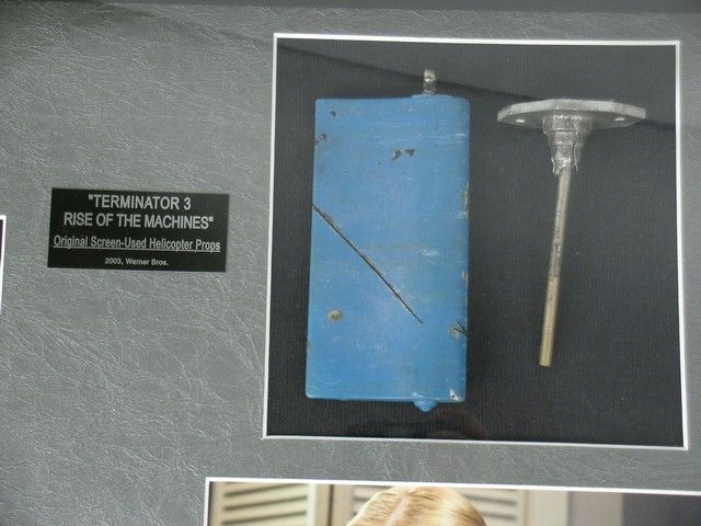From "Terminator 3: Rise of the Machines" (2003), a rare combination of signed photos from the two major robotic warriors: The Terminator (Arnold Schwarzenegger), and his worthy adversary, T-X (Kristanna Loken). The grand climax comes at the Skynet headquarters where first T-X crashes through with her helicopter, and then the Terminator smashes through with his helicopter to save the day ("I'm back!"). Along with the photos is a screen used piece of one of the helicopter miniature tails. This beautifully mounted and framed display is approx. 25.5" x19.5" x 3". COA included for both photos and helicopter pieces.