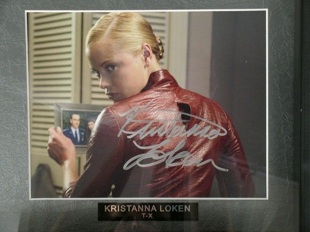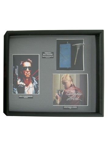 From "Terminator 3: Rise of the Machines" (2003), a rare combination of signed photos from the two major robotic warriors: The Terminator (Arnold Schwarzenegger), and his worthy adversary, T-X (Kristanna Loken). The grand climax comes at the Skynet headquarters where first T-X crashes through with her helicopter, and then the Terminator smashes through with his helicopter to save the day ("I'm back!"). Along with the photos is a screen used piece of one of the helicopter miniature tails. This beautifully mounted and framed display is approx. 25.5" x19.5" x 3". COA included for both photos and helicopter pieces.