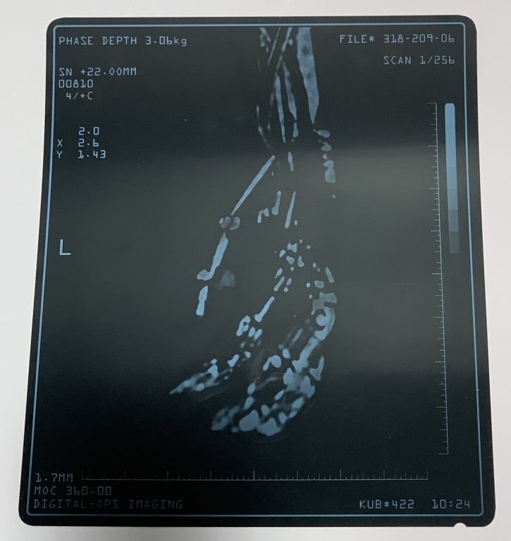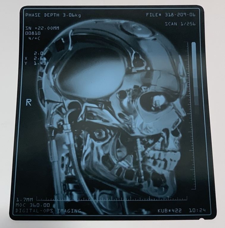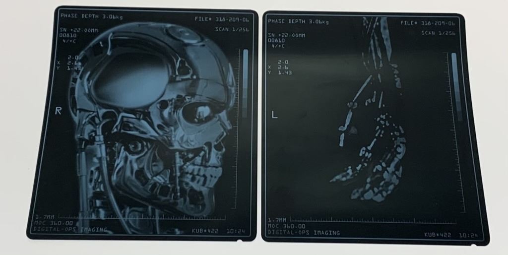 Set of 2 x-ray's for the model 101 from "Cyberdyne Systems" used in the production of 'Terminator Salvation' (2009), the military science fiction action movie where, in 2018, a mysterious new weapon in the war against the machines, half-human and half-machine, comes to John Connor on the eve of a resistance attack on Skynet. But whose side is he on, and can he be trusted?