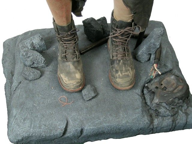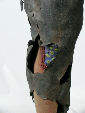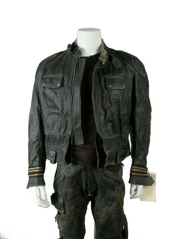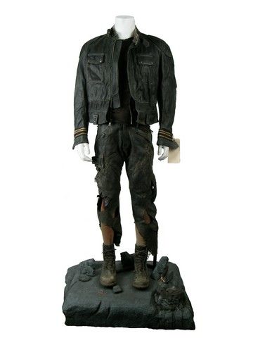 Although "Terminator Salvation" (2009), finally wraps up much of John Connor's (Christian Bale) destiny, the film really belongs to Marcus Wright (Sam Worthington) who goes through a staggering gauntlet (including beginning the film in jail getting a lethal injection!) of both emotional and physical transformation. In a key sequence near the end of the film, he is on the run when he realizes he is more cyborg than human, and the Resistance believes he's the enemy. In order to flush him out of a forest at night, they instigate an "Apocalypse Now" style napalm bombing creating a towering sheet of fire. Since he is more metal than flesh, he survives, and comes out of the inferno to confront Connor's, and finally to get him into Skynet headquarters to help him in a final battle. This is a true museum quality display piece. A mannequin set up on a base of faux-rock and stone, complete with the smashed "skull" of a T-800 Terminator, and a piece of broken conduit. On the mannequin is Marcus' screen worn outfit that he wears right before the explosion. It includes a leather pants, leather jacket, shirt and boots. (Mannequin with base is over 75" tall). Oversized item. Additional Shipping Required.