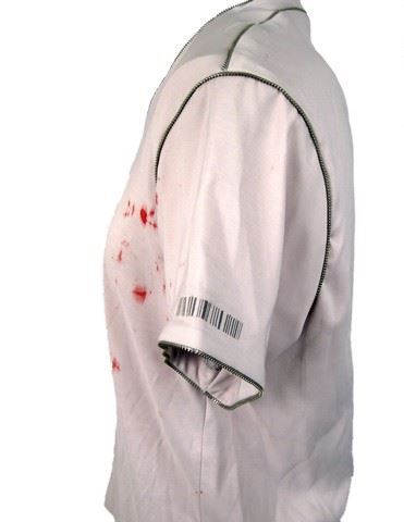 Screen worn Marcus Wright (Sam Worthington) costume from the film Termination Salvation (2009), the fourth installment in the series. Silver scrubs with blood spots, barcode on tunic sleeve, and zipper piping lining the tunic's seams, neckline and sleeves. These scrubs are worn onscreen when Marcus awakes in the Terminator "hospital" in the last part of the film and when he throws the chair through the window in the trailer.