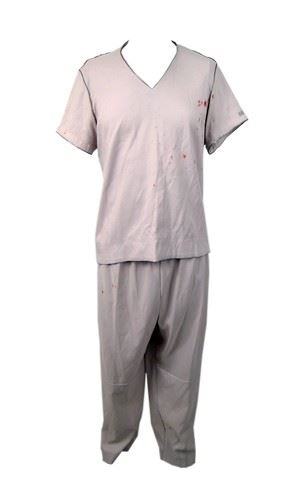 Screen worn Marcus Wright (Sam Worthington) costume from the film Termination Salvation (2009), the fourth installment in the series. Silver scrubs with blood spots, barcode on tunic sleeve, and zipper piping lining the tunic's seams, neckline and sleeves. These scrubs are worn onscreen when Marcus awakes in the Terminator "hospital" in the last part of the film and when he throws the chair through the window in the trailer.