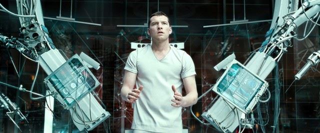 Screen worn Marcus Wright (Sam Worthington) costume from the film Termination Salvation (2009), the fourth installment in the series. Silver scrubs with blood spots, barcode on tunic sleeve, and zipper piping lining the tunic's seams, neckline and sleeves. These scrubs are worn onscreen when Marcus awakes in the Terminator "hospital" in the last part of the film and when he throws the chair through the window in the trailer.