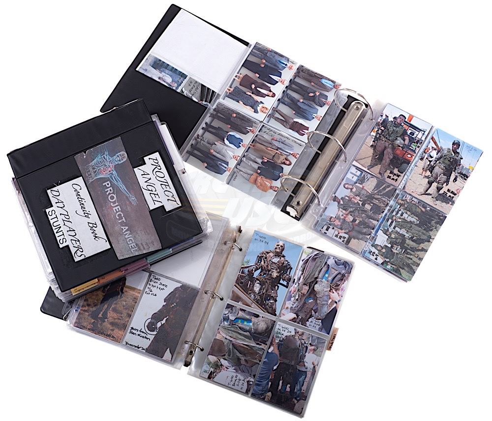 (Warner Bros., 2009) This set of three binders were used as the on set background actor continuity books. The binders feature countless one of a kind images of the background actors for the various scenes in the film, including the impressive T-600 Terminator puppet. The images are held in plastic sleeves and feature handwritten details for each actors scene number and placement. A very rare production artifact. Minor wear from use is present.