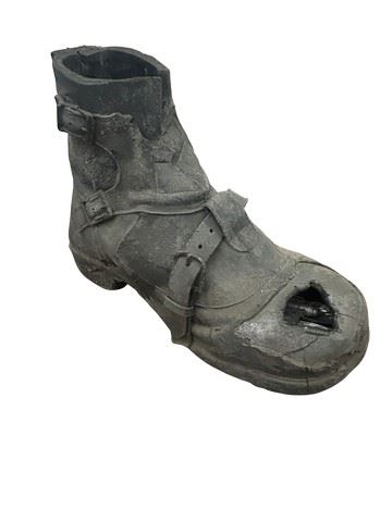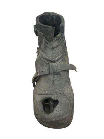 This screen used Terminator T-600 boot was screen used for special fx scenes. The top of the boot has a hole with a section of a Terminator Endoskeleton piece inside. 15"x 12"x7" wide.
