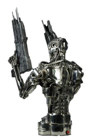 Terminator T-800 Scale Collectible Bust (released in 2009) - Endoskeleton Bust by Hollywood Collector's Gallery, numbered 170/1000. This bust captures the metallic, inhuman visage of the Terminator cyborg dual wielding Plasma Rifles. Crafted of polystone and real metal elements, the T-800 Endoskeleton Bust stands approx. 20" high. LED features add the piercing which can be used alone or in conjunction with the additional flashing blue lights of the endoskeleton's machinery. This limited and rare bust is a must have to any collection!! Approximate size: 20" x10. Box Size: 27"x19"x11". Weighs approx. 15lbs. Originally sold for $2,000 retail. Due to the size of this collectible it will be taken to a third party shipping company to professionally pack and ship for the most efficient price. Comes with original box which is in used condition, however the actual bust pieces have never been removed from the original packaging. Item was removed from the box for photos only.