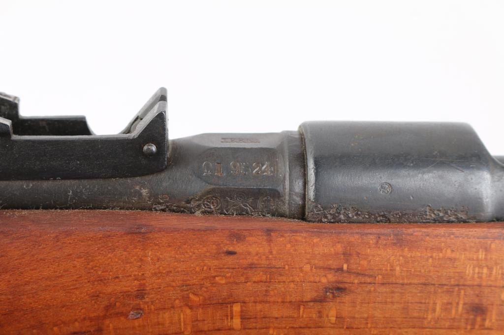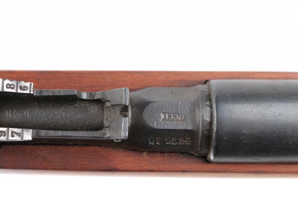 Italian military bolt action rifle, probably manufactured circa 1917. Imported by CAI, St Albans VT. Has crossed rifles "Accuracy Mark" stamped over the chamber. Features 31" barrel, blade front sight, bayonet lug, tangent rear sight, manual safety, sling swivels, wood stocks with almost full length forend & half length handguard, cleaning rod. Bore is fair to good condition with frosting, some darkness, strong rifling. Retains 90% re-blue with visible pitting along wood line of receiver. Wood is sanded, good condition, with gaps around buttplate, loose rear band. Condition is NRA Very Good (as refinished) *** C&R Firearm ***