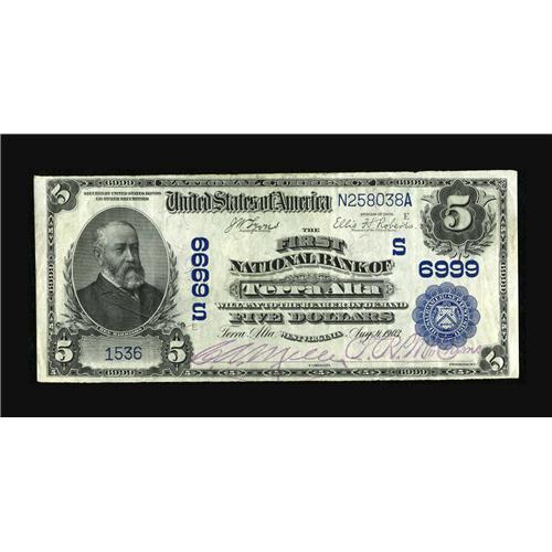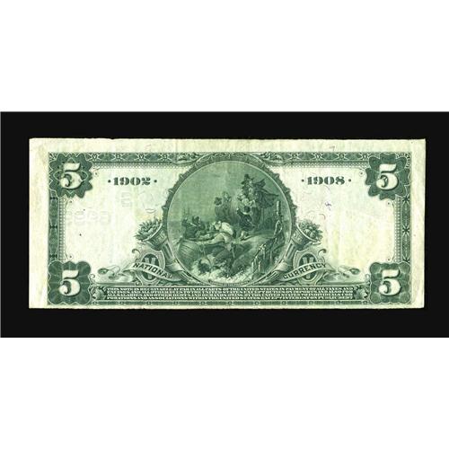 <B>Terra Alta, WV</B></I> - $5 1902 Date Back Fr. 590 <B>The First NB</B></I> Ch. # (S)6999<BR>This was the sole issuer located in this Preston County community. Chartered in 1903, it ceased operating in 1931 and leaves a legacy of 13 large notes documented in the census, although just one, likely this example, is of the $5 1902 Date Back design. The example we offer here retains its pack fresh crispness, is nicely centered and has all the eye appeal of any fully uncirculated note. The several folds are really more in the nature of bends and fail to detract in any way from the stunning appearance of this scarce item. The purple stamped officers' signatures remain as bold as the day they were laid down. This is quite simply an exceptionally nice looking note. <B>Extremely Fine</B></I> and well worth a premium bid.<BR><BR><b>Shipping:</b> Coin/Currency (<a target="_blank" href="http://www.heritageauctions.com/common/shipping.php">view shipping information</a>)