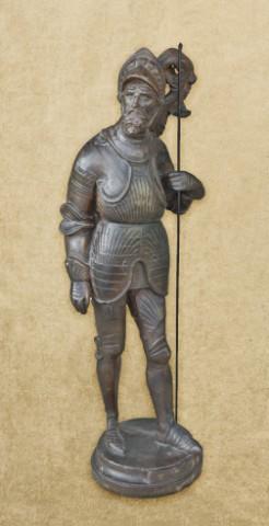 Terra-cotta statue of knight in armor entitled Bois Guilbert. 19th to early 20th century, shows a dark brown finish to simulate bronze. Shows small cracks, small losses and repairs. Measures approx. 40” in height including the base. The figure resembles a Spanish Conquistador and is holding a metal associated spear. Est: $350 - $700