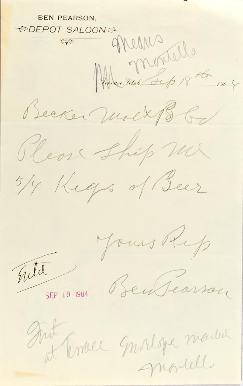 A handwritten beer order from the owner of the Depot Saloon to the Becker Brewing company.