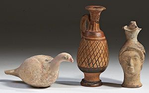 Terracotta. Three pottery items.   D/ Canosan terracotta dove; hellenistic period, circa 4th-3rd century BC. (13 cm length). Traces of pigments, repaired. Apulian acorn-lekythos, net-patterned; circa 4th century BC. (12 cm high). Minor chip on rim.  Attic pottery figural oinochoe, the body in the form of a female head; circa 5th century BC. (10 cm high). Missing handle, chip on rim.