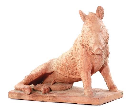 Terracotta boar recumbent on matching plinth. H19 1/4in W20 1/2in D21 3/4in Provenance: Estate of Irl Paul & Barbara Middleton, Atlanta, Georgia.