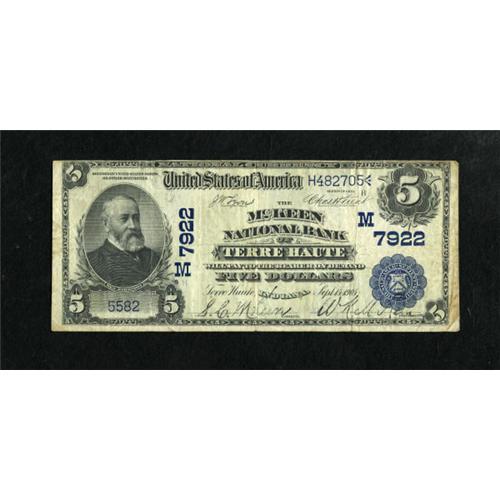 <B>Terre Haute, IN</B></I> - $5 1902 Date Back Fr. 591 <B>The McKeen NB</B></I> Ch. # (M)7922<BR> This was a privately owned bank ran by the McKeen family until it exited the banking stage in 1928. 1902 Date Backs on this bank are outnumbered by Plain Backs in the census by five to one. <B>Fine+.</B></I><BR><BR><b>Shipping:</b> Coins & Currency (<a target="_blank" href="http://www.heritageauctions.com/common/shipping.php">view shipping information</a>)