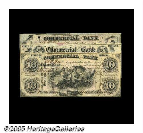 <B>Terre Haute, IN- Commercial Bank</B></I> $2, $5, $10 Aug. 3, 1858 Wolka 797-3, 5, 9<BR>All three of these certificates of deposit carry a small punch cancel and the Keokuk, Iowa overstamp. The $5 grades <B>About Uncirculated,</B></I> ink spot; while the $2 and $10 grade <B>Choice Crisp Uncirculated.</B></I><BR>