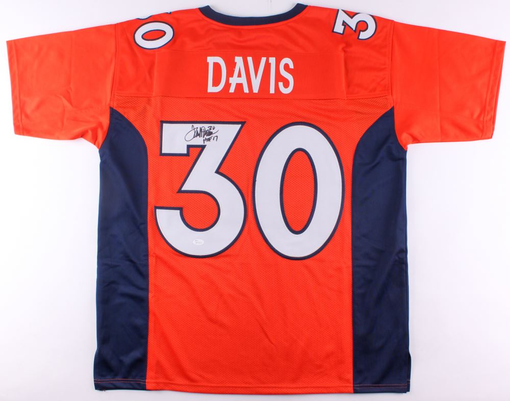 Custom on-field style jersey. Everything is sewn on, size XL. Hand-signed in black felt-tip pen by Terrell Davis (HOF).