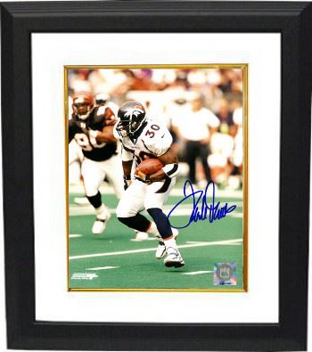 Terrell Davis played for the Denver Broncos from 1995 to 2001. Davis was drafted by the Broncos in the sixth round (196th pick overall) of the 1995 NFL Draft. Davis is the Denver Broncos all-time leading rusher, with 7,607 rushing yards. As a player, he was given the nickname "T. D." by players, fans and the media; this denoted both the initials of his first and last name as well as being an abbreviation for touchdown. In 1998, Davis rushed for 2,008 yards becoming a member of the 2000 rushing yards club, then the third highest rushing total in history. This performance earned him league MVP honors, his third straight AFC rushing title, his first NFL rushing title, and his second time being named NFL Offensive Player of the Year by the Associated Press. At the end of the season, the Broncos beat the Atlanta Falcons in Super Bowl XXXIII, with Davis recording 102 rushing yards and 50 receiving yards. Terrell Davis has hand signed this Denver Broncos 8x10 Photo. Certificate of Authenticity from Athlon Sports. Custom White Mat and Premium Black Color Framed as shown.