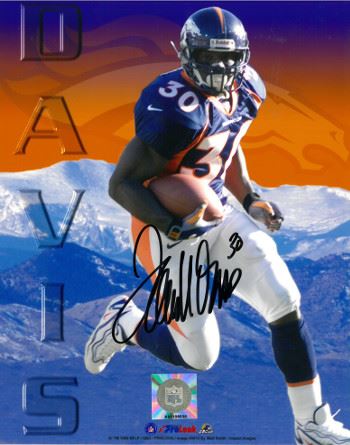 Terrell Davis played for the Denver Broncos from 1995 to 2001. Davis was drafted by the Broncos in the sixth round (196th pick overall) of the 1995 NFL Draft. Davis is the Denver Broncos all-time leading rusher, with 7,607 rushing yards. As a player, he was given the nickname "T. D." by players, fans and the media; this denoted both the initials of his first and last name as well as being an abbreviation for touchdown. In 1998, Davis rushed for 2,008 yards becoming a member of the 2000 rushing yards club, then the third highest rushing total in history. This performance earned him league MVP honors, his third straight AFC rushing title, his first NFL rushing title, and his second time being named NFL Offensive Player of the Year by the Associated Press. At the end of the season, the Broncos beat the Atlanta Falcons in Super Bowl XXXIII, with Davis recording 102 rushing yards and 50 receiving yards. Terrell Davis has hand signed this Denver Broncos 8x10 Photo. Certificate of Authenticity from Athlon Sports.