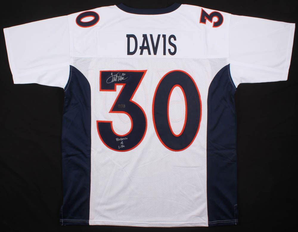 Custom on-field style jersey. Everything is sewn on, size XL. Hand-signed and inscribed in silver paint pen by Terrell Davis (HOF).