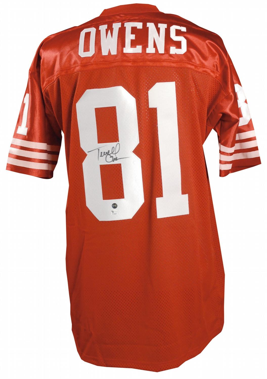 Replica San Francisco 49ers home football jersey, with sewn on letters and numbers, signed in black felt tip on the number on the back. In very fine condition.