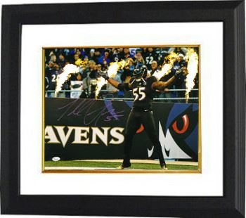 Terrell Suggs was drafted by the Baltimore Ravens with the Tenth overall Pick in the 2003 NFL Draft. Suggs' enjoyed immediate success in his rookie year, as he recorded 12 sacks and 1 interception and earning Defensive Rookie of The Year honors while playing the left outside linebacker position in Baltimore's 3-4 defensive scheme. Suggs was key in the Ravens win over the Denver Broncos in the divisional round of the playoffs with two sacks on Broncos Quarterback Peyton Manning, after which, the Ravens advanced to New England in a rematch of the previous year's AFC championship game where they defeated the Patriots 28-13. The win gave Suggs his first ever AFC Championship and his first appearance in the Super Bowl, being Super Bowl XLVII against the San Francisco 49ers. In that game, the Ravens won 34-31, earning Suggs his first Super Bowl ring. Terrell Suggs has hand autographed this Baltimore Ravens 16x20 Photo. JSA Hologram and Certificate of Authenticity from Athlon Sports Collectibles. Custom White Mat and Premium Black Color Framed as shown.